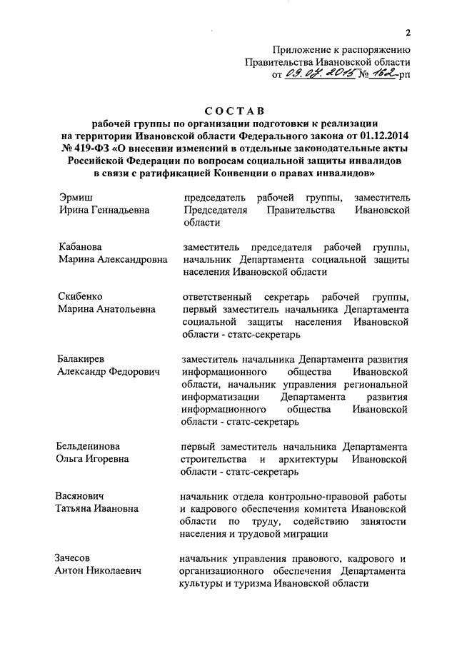 Распоряжение Правительства Ивановской области от 09.07.2015 N 162-рп "О создании рабочей группы по организации подготовки к реализации на территории Ивановской области Федерального закона от 01.12.2014 N 419-ФЗ "О внесении изменений в отдельные законодательные акты Российской Федерации по вопросам социальной защиты инвалидов в связи с ратификацией Конвенции о правах инвалидов"