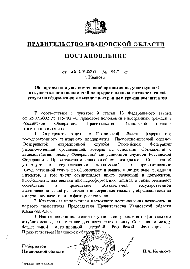 Постановление Правительства Ивановской области от 29.07.2015 N 347-п "Об определении уполномоченной организации, участвующей в осуществлении полномочий по предоставлению государственной услуги по оформлению и выдаче иностранным гражданам патентов"