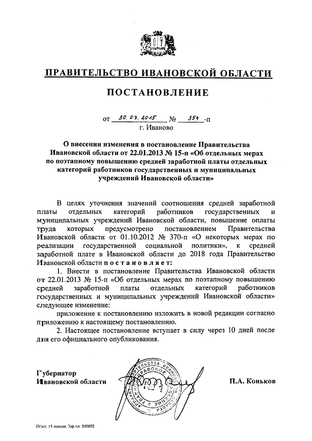 Постановление Правительства Ивановской области от 30.07.2015 N 354-п "О внесении изменения в постановление Правительства Ивановской области от 22.01.2013 N 15-п "Об отдельных мерах по поэтапному повышению средней заработной платы отдельных категорий работников государственных и муниципальных учреждений Ивановской области"