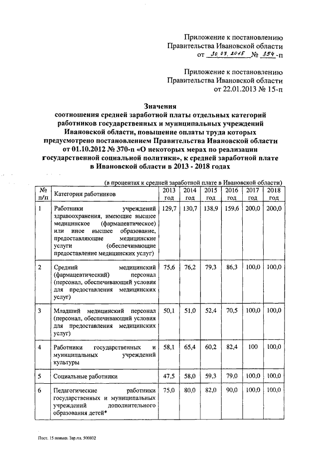 Постановление Правительства Ивановской области от 30.07.2015 N 354-п "О внесении изменения в постановление Правительства Ивановской области от 22.01.2013 N 15-п "Об отдельных мерах по поэтапному повышению средней заработной платы отдельных категорий работников государственных и муниципальных учреждений Ивановской области"
