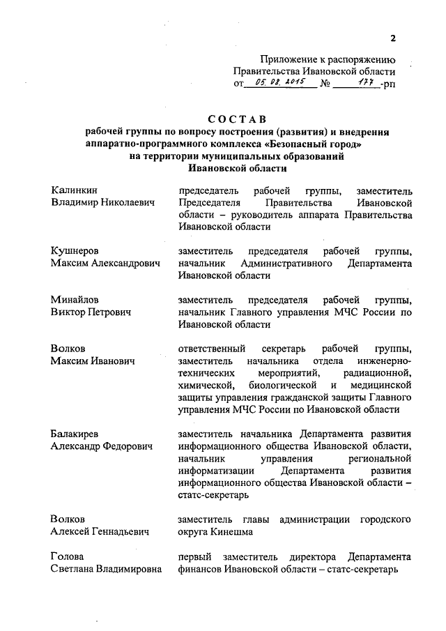 Распоряжение Правительства Ивановской области от 05.08.2015 N 177-рп "О создании рабочей группы по вопросу построения (развития) и внедрения аппаратно-программного комплекса "Безопасный город" на территории муниципальных образований Ивановской области"