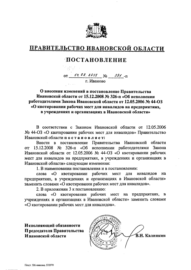 Постановление Правительства Ивановской области от 14.08.2015 N 391-п "О внесении изменений в постановление Правительства Ивановской области от 15.12.2008 N 326-п "Об исполнении работодателями Закона Ивановской области от 12.05.2006 N 44-ОЗ "О квотировании рабочих мест для инвалидов на предприятиях, в учреждениях и организациях в Ивановской области"