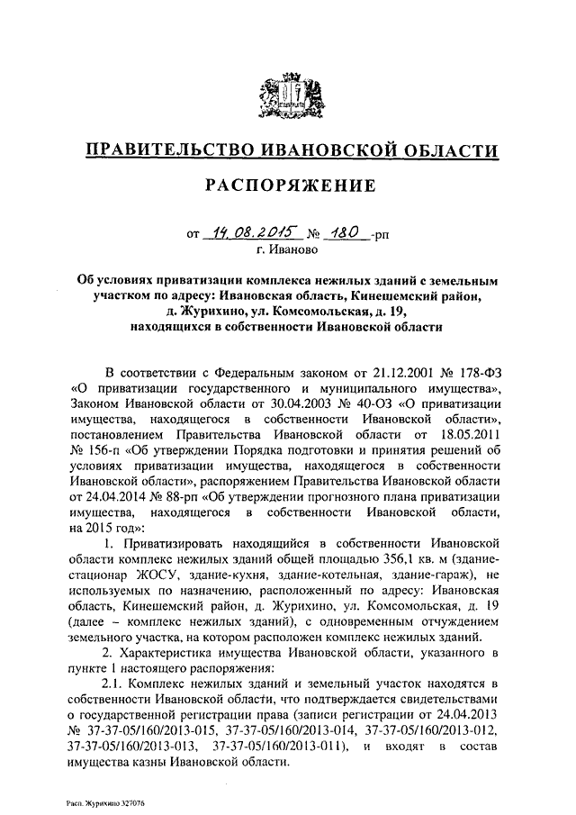 Распоряжение Правительства Ивановской области от 14.08.2015 N 180-рп "Об условиях приватизации комплекса нежилых зданий с земельным участком по адресу: Ивановская область, Кинешемский район, д. Журихино, ул. Комсомольская, д. 19, находящихся в собственности Ивановской области"