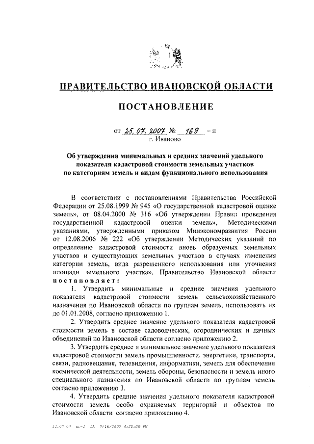 Постановление Правительства Ивановской области от 25.07.2007 N 169-п "Об утверждении минимальных и средних значений удельного показателя кадастровой стоимости земельных участков по категориям земель и видам функционального использования"