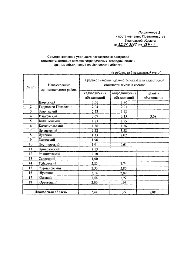Постановление Правительства Ивановской области от 25.07.2007 N 169-п "Об утверждении минимальных и средних значений удельного показателя кадастровой стоимости земельных участков по категориям земель и видам функционального использования"