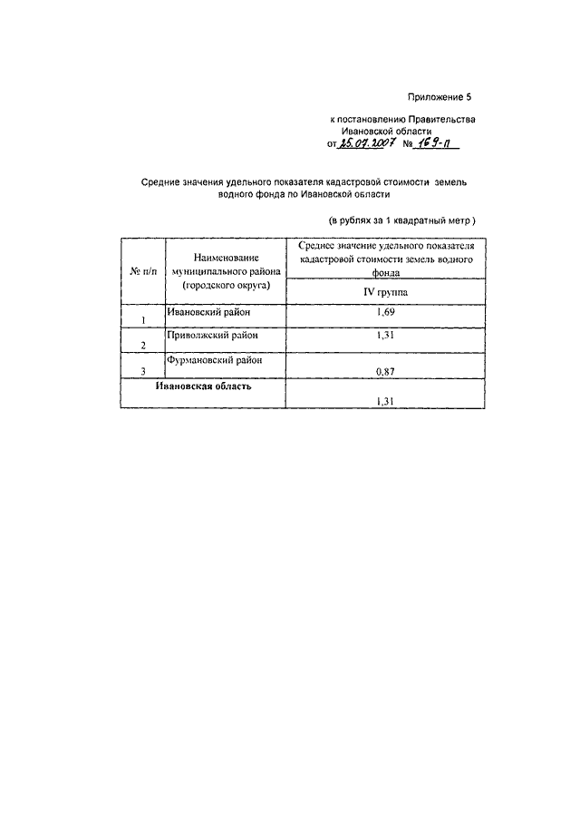 Постановление Правительства Ивановской области от 25.07.2007 N 169-п "Об утверждении минимальных и средних значений удельного показателя кадастровой стоимости земельных участков по категориям земель и видам функционального использования"