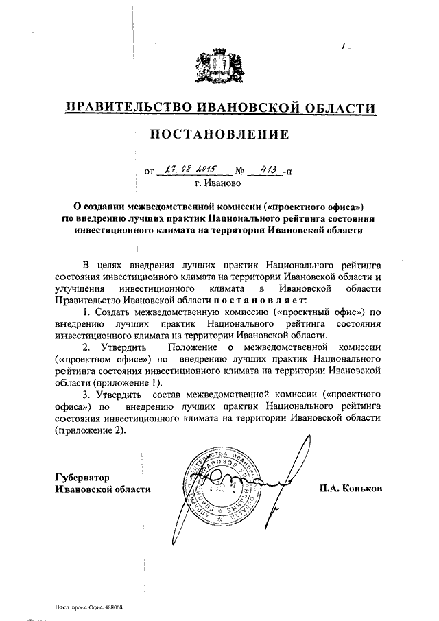 Постановление Правительства Ивановской области от 27.08.2015 N 413-п "О создании межведомственной комиссии ("проектного офиса") по внедрению лучших практик Национального рейтинга состояния инвестиционного климата на территории Ивановской области" (вместе с "Положением о межведомственной комиссии ("проектном офисе") по внедрению лучших практик Национального рейтинга состояния инвестиционного климата на территории Ивановской области")