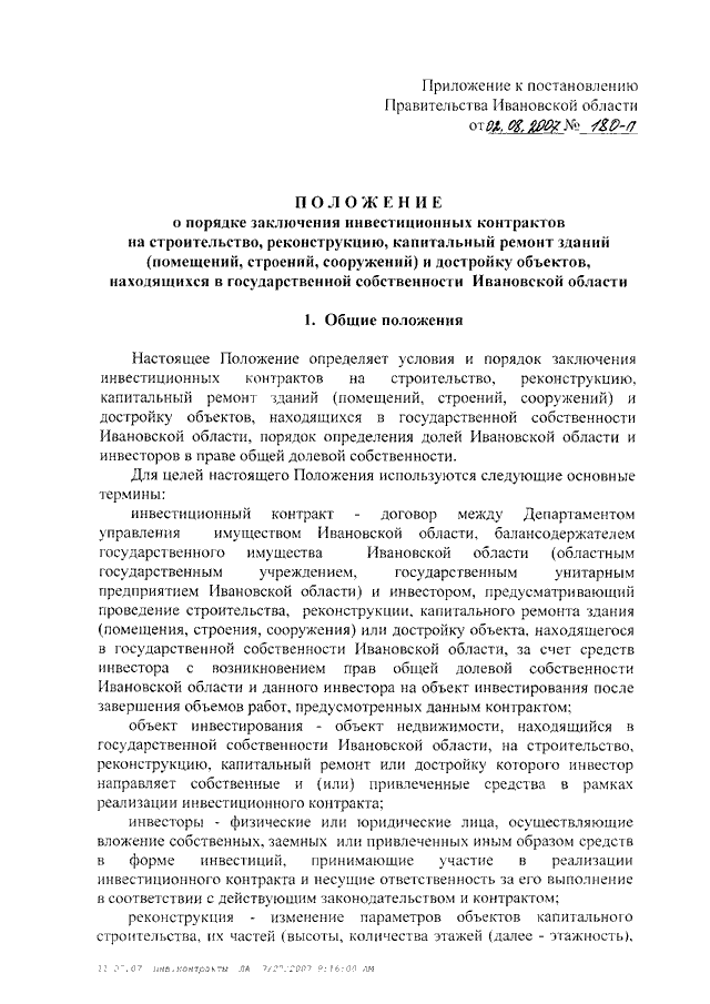 Постановление Правительства Ивановской области от 02.08.2007 N 180-п "Об утверждении Положения о порядке заключения инвестиционных контрактов на строительство, реконструкцию, капитальный ремонт зданий (помещений, строений, сооружений) и достройку объектов, находящихся в государственной собственности Ивановской области"