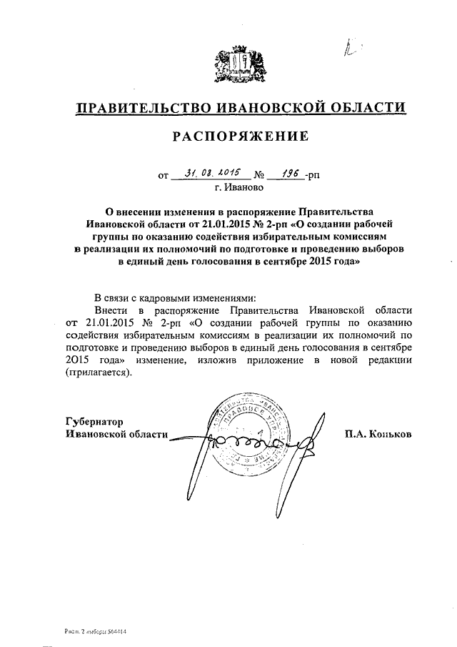 Распоряжение Правительства Ивановской области от 31.08.2015 N 196-рп "О внесении изменения в распоряжение Правительства Ивановской области от 21.01.2015 N 2-рп "О создании рабочей группы по оказанию содействия избирательным комиссиям в реализации их полномочий по подготовке и проведению выборов в единый день голосования в сентябре 2015 года"