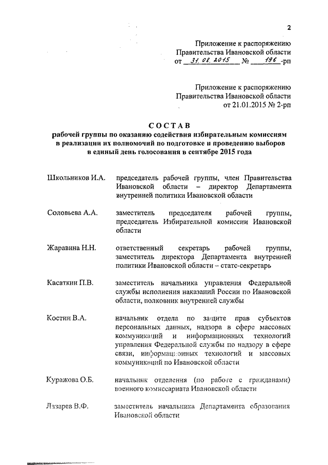 Распоряжение Правительства Ивановской области от 31.08.2015 N 196-рп "О внесении изменения в распоряжение Правительства Ивановской области от 21.01.2015 N 2-рп "О создании рабочей группы по оказанию содействия избирательным комиссиям в реализации их полномочий по подготовке и проведению выборов в единый день голосования в сентябре 2015 года"