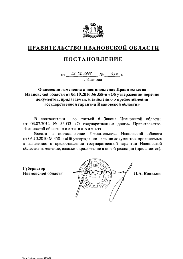 Постановление Правительства Ивановской области от 03.09.2015 N 417-п "О внесении изменения в постановление Правительства Ивановской области от 06.10.2010 N 358-п "Об утверждении перечня документов, прилагаемых к заявлению о предоставлении государственной гарантии Ивановской области"