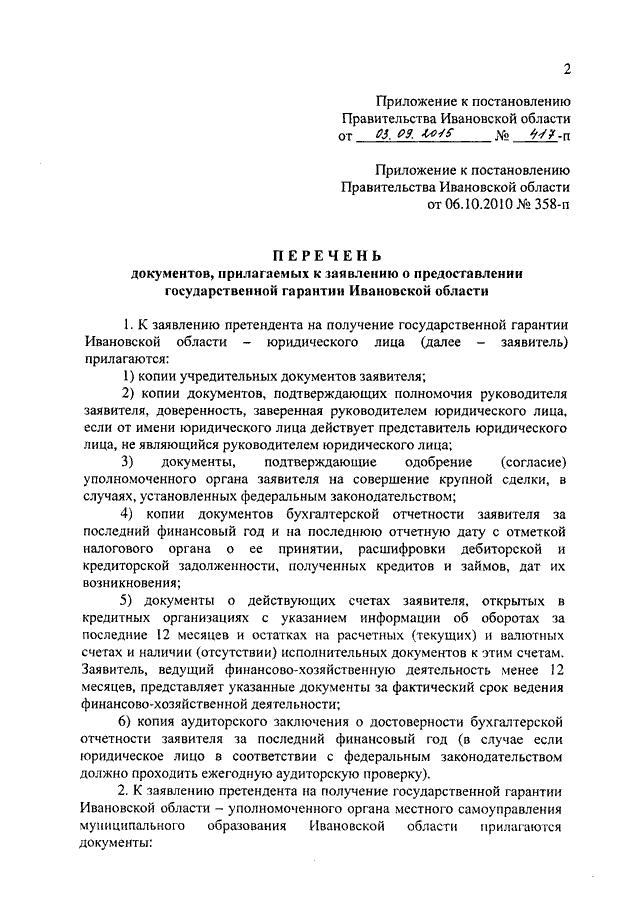 Постановление Правительства Ивановской области от 03.09.2015 N 417-п "О внесении изменения в постановление Правительства Ивановской области от 06.10.2010 N 358-п "Об утверждении перечня документов, прилагаемых к заявлению о предоставлении государственной гарантии Ивановской области"
