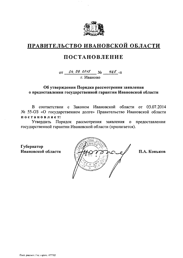 Постановление Правительства Ивановской области от 04.09.2015 N 425-п "Об утверждении Порядка рассмотрения заявления о предоставлении государственной гарантии Ивановской области"