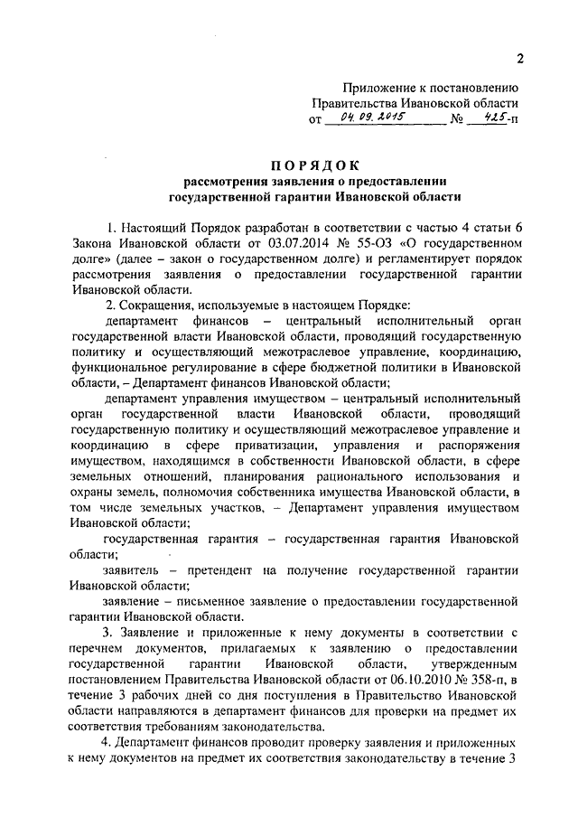 Постановление Правительства Ивановской области от 04.09.2015 N 425-п "Об утверждении Порядка рассмотрения заявления о предоставлении государственной гарантии Ивановской области"