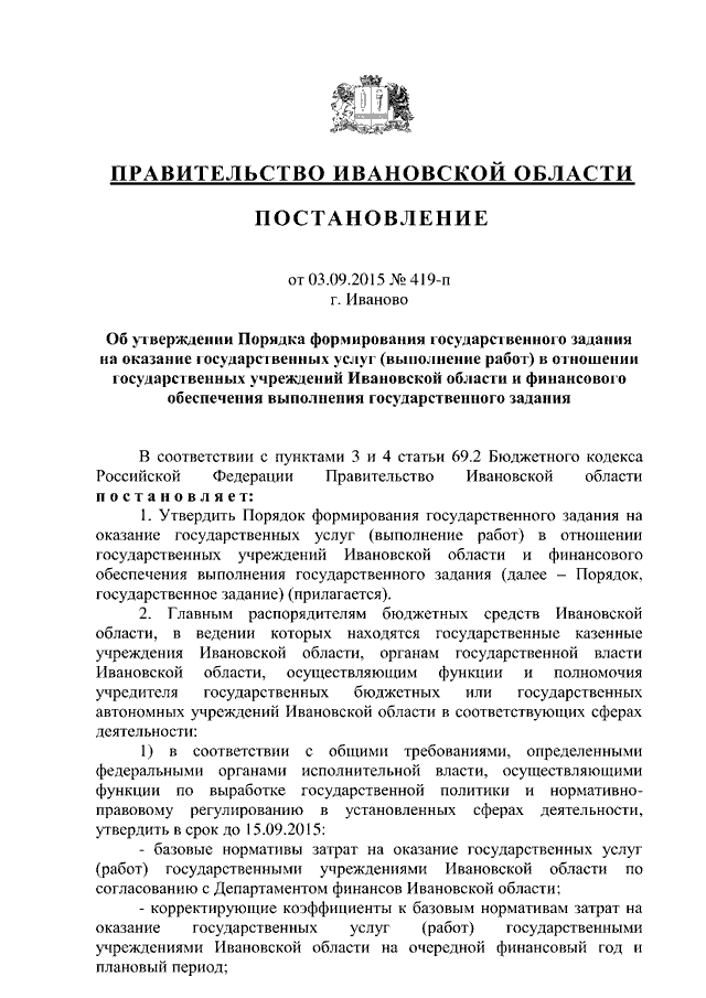 Постановление Правительства Ивановской области от 03.09.2015 N 419-п "Об утверждении Порядка формирования государственного задания на оказание государственных услуг (выполнение работ) в отношении государственных учреждений Ивановской области и финансового обеспечения выполнения государственного задания"