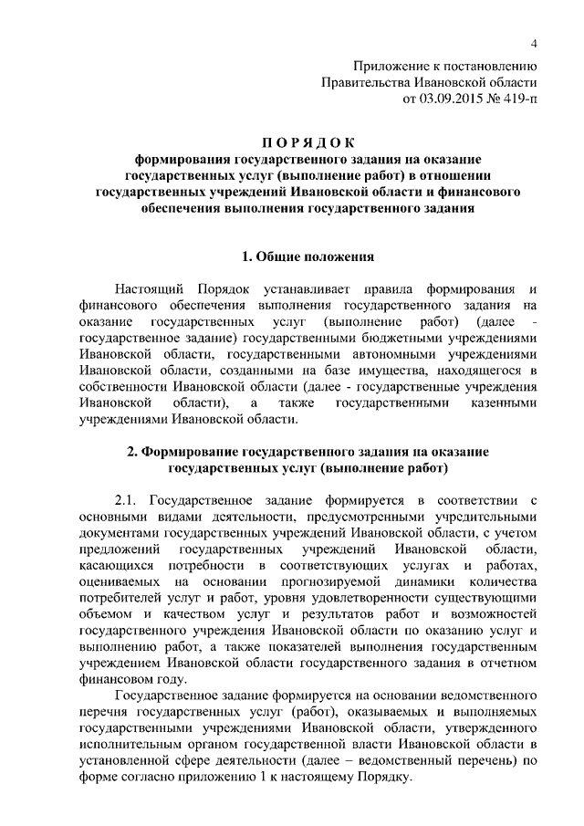 Постановление Правительства Ивановской области от 03.09.2015 N 419-п "Об утверждении Порядка формирования государственного задания на оказание государственных услуг (выполнение работ) в отношении государственных учреждений Ивановской области и финансового обеспечения выполнения государственного задания"