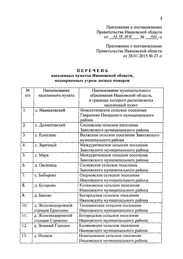 Постановление Правительства Ивановской области от 03.09.2015 N 423-п "О внесении изменения в постановление Правительства Ивановской области от 28.01.2015 N 27-п "Об утверждении перечня населенных пунктов Ивановской области, подверженных угрозе лесных пожаров"