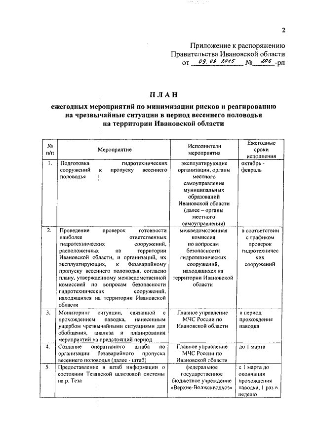 Распоряжение Правительства Ивановской области от 09.09.2015 N 206-рп "О плане ежегодных мероприятий по минимизации рисков и реагированию на чрезвычайные ситуации в период весеннего половодья на территории Ивановской области"