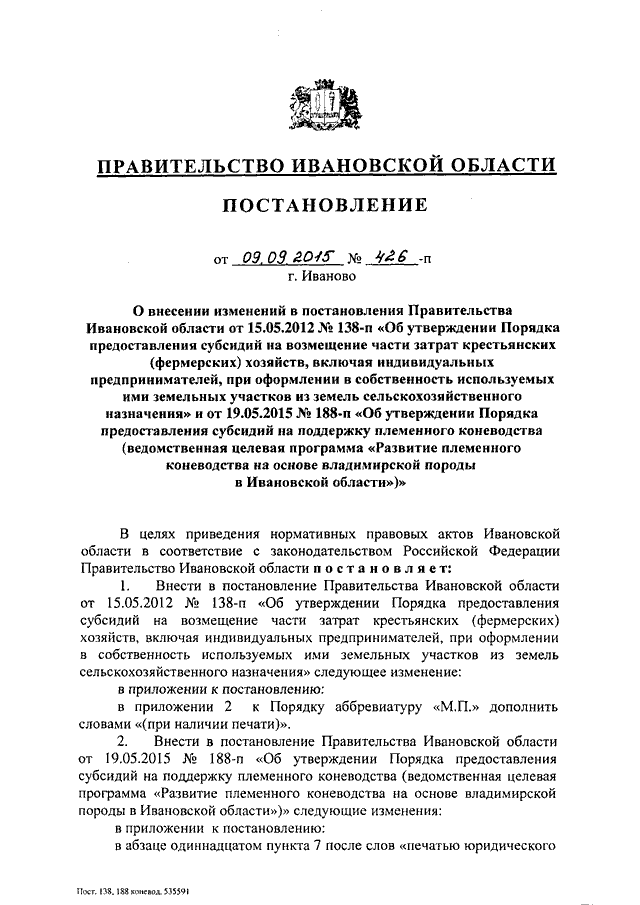 Постановление Правительства Ивановской области от 09.09.2015 N 426-п "О внесении изменений в постановления Правительства Ивановской области от 15.05.2012 N 138-п "Об утверждении Порядка предоставления субсидий на возмещение части затрат крестьянских (фермерских) хозяйств, включая индивидуальных предпринимателей, при оформлении в собственность используемых ими земельных участков из земель сельскохозяйственного назначения" и от 19.05.2015 N 188-п "Об утверждении Порядка предоставления субсидий на поддержку племенного коневодства (ведомственная целевая программа "Развитие племенного коневодства на основе владимирской породы в Ивановской области")"