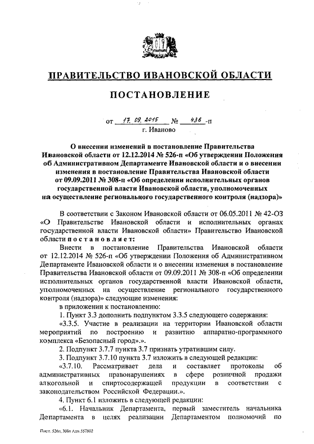 Постановление Правительства Ивановской области от 17.09.2015 N 436-п "О внесении изменений в постановление Правительства Ивановской области от 12.12.2014 N 526-п "Об утверждении Положения об Административном Департаменте Ивановской области и о внесении изменения в постановление Правительства Ивановской области от 09.09.2011 N 308-п "Об определении исполнительных органов государственной власти Ивановской области, уполномоченных на осуществление регионального государственного контроля (надзора)"