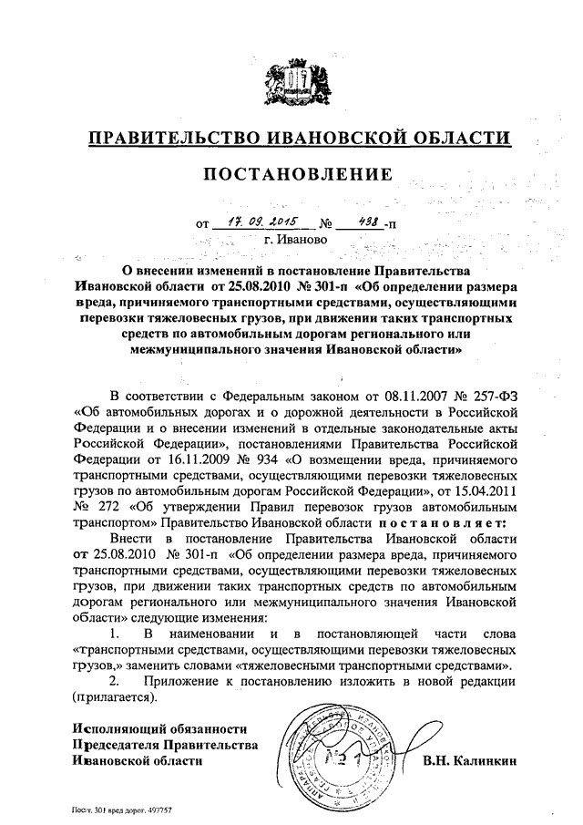 Постановление Правительства Ивановской области от 17.09.2015 N 438-п "О внесении изменений в постановление Правительства Ивановской области от 25.08.2010 N 301-п "Об определении размера вреда, причиняемого транспортными средствами, осуществляющими перевозки тяжеловесных грузов, при движении таких транспортных средств по автомобильным дорогам регионального или межмуниципального значения Ивановской области"