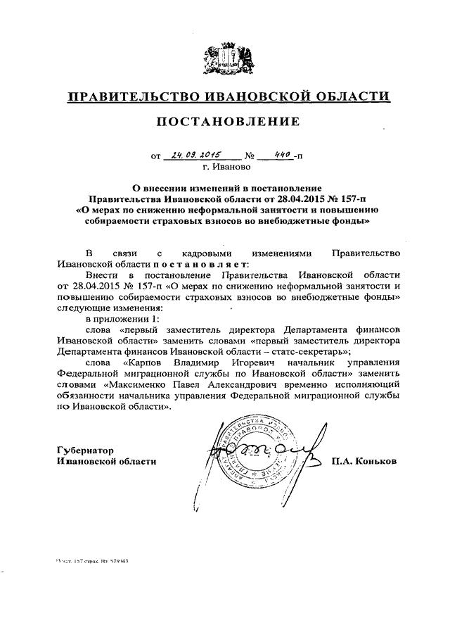 Постановление Правительства Ивановской области от 24.09.2015 N 440-п "О внесении изменений в постановление Правительства Ивановской области от 28.04.2015 N 157-п "О мерах по снижению неформальной занятости и повышению собираемости страховых взносов во внебюджетные фонды"