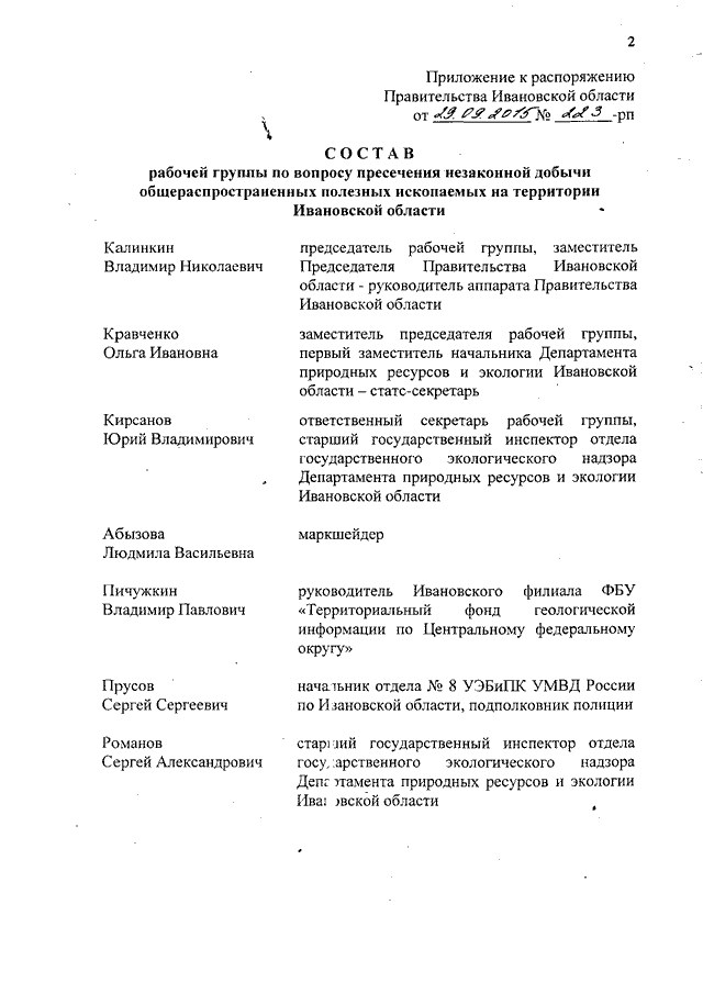 Распоряжение Правительства Ивановской области от 29.09.2015 N 223-рп "О создании рабочей группы по вопросу пресечения незаконной добычи общераспространенных полезных ископаемых на территории Ивановской области"