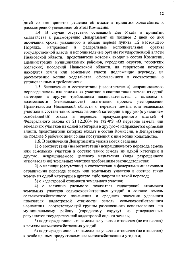 Постановление Правительства Ивановской области от 05.10.2015 N 455-п "О реализации полномочий в сфере земельных отношений" (вместе с "Положением о межведомственной комиссии по реализации полномочий в сфере земельных отношений", "Порядком рассмотрения ходатайств о переводе земель или земельных участков в составе таких земель из одной категории в другую и заявлений о включении земельных участков в границы населенных пунктов либо об исключении земельных участков из границ населенных пунктов", "Перечнем исполнительных органов государственной власти Ивановской области, рассматривающих проекты документов территориального планирования")