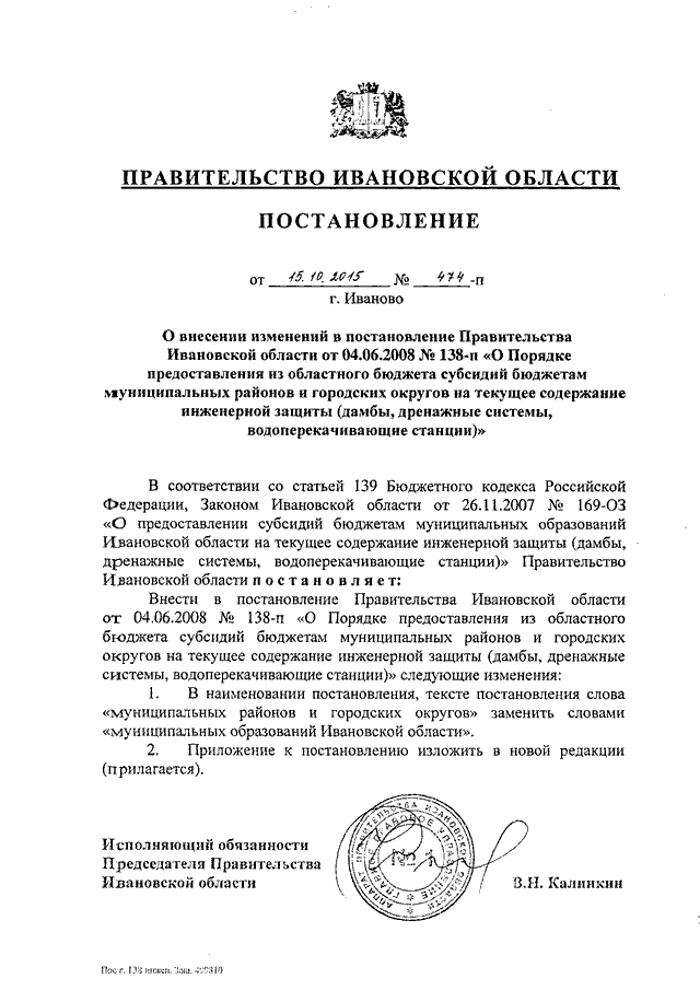 Постановление Правительства Ивановской области от 15.10.2015 N 474-п "О внесении изменений в постановление Правительства Ивановской области от 04.06.2008 N 138-п "О Порядке предоставления из областного бюджета субсидий бюджетам муниципальных районов и городских округов на текущее содержание инженерной защиты (дамбы, дренажные системы, водоперекачивающие станции)" (вместе с "Порядком предоставления из областного бюджета субсидий бюджетам муниципальных образований Ивановской области на текущее содержание инженерной защиты (дамбы, дренажные системы, водоперекачивающие станции)")
