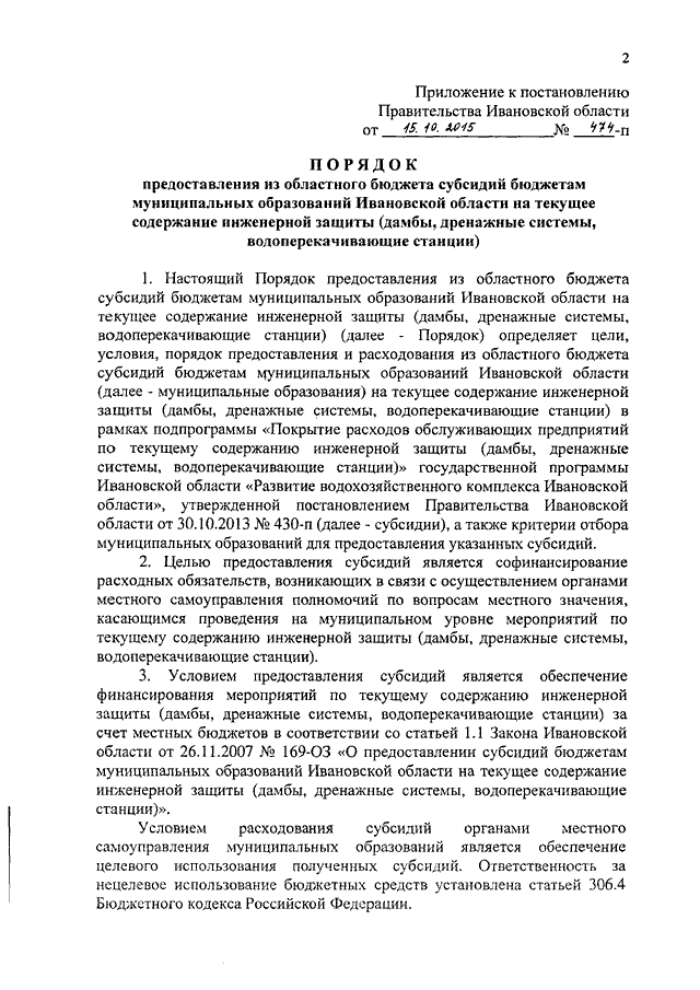 Постановление Правительства Ивановской области от 15.10.2015 N 474-п "О внесении изменений в постановление Правительства Ивановской области от 04.06.2008 N 138-п "О Порядке предоставления из областного бюджета субсидий бюджетам муниципальных районов и городских округов на текущее содержание инженерной защиты (дамбы, дренажные системы, водоперекачивающие станции)" (вместе с "Порядком предоставления из областного бюджета субсидий бюджетам муниципальных образований Ивановской области на текущее содержание инженерной защиты (дамбы, дренажные системы, водоперекачивающие станции)")