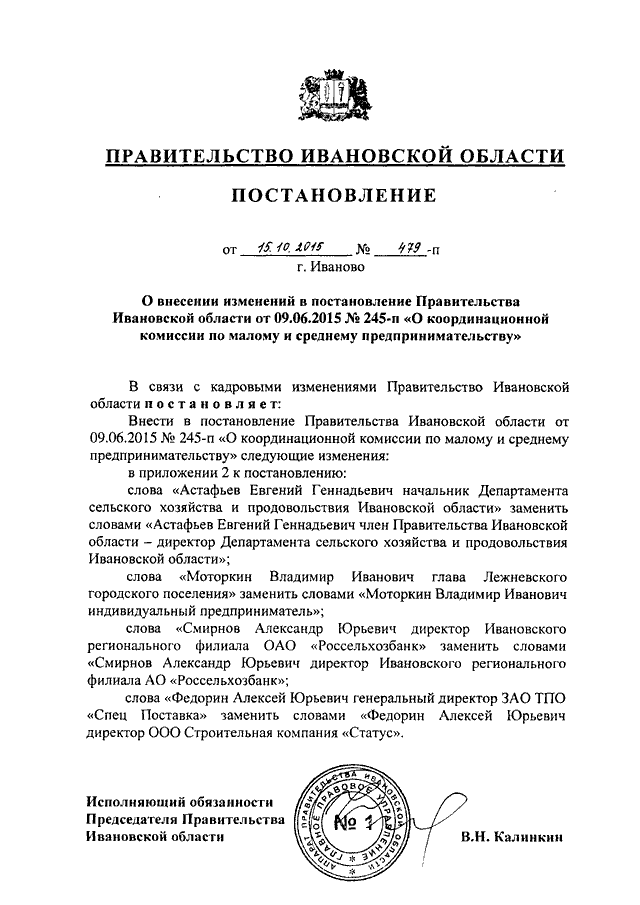 Постановление Правительства Ивановской области от 15.10.2015 N 479-п "О внесении изменений в постановление Правительства Ивановской области от 09.06.2015 N 245-п "О координационной комиссии по малому и среднему предпринимательству"