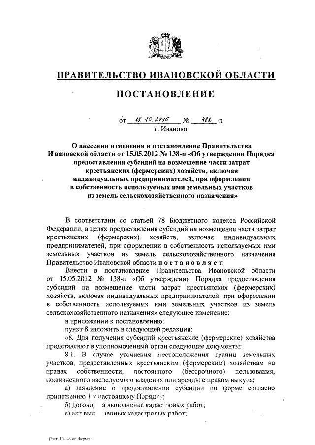 Постановление Правительства Ивановской области от 15.10.2015 N 482-п "О внесении изменения в постановление Правительства Ивановской области от 15.05.2012 N 138-п "Об утверждении Порядка предоставления субсидий на возмещение части затрат крестьянских (фермерских) хозяйств, включая индивидуальных предпринимателей, при оформлении в собственность используемых ими земельных участков из земель сельскохозяйственного назначения"
