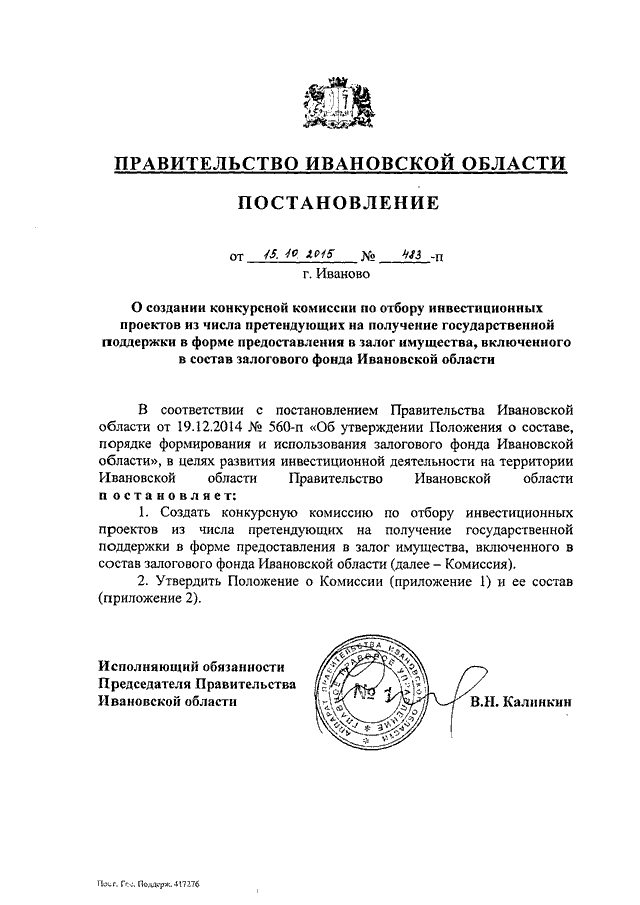 Постановление Правительства Ивановской области от 15.10.2015 N 483-п "О создании конкурсной комиссии по отбору инвестиционных проектов из числа претендующих на получение государственной поддержки в форме предоставления в залог имущества, включенного в состав залогового фонда Ивановской области" (вместе с "Положением о конкурсной комиссии по отбору инвестиционных проектов из числа претендующих на получение государственной поддержки в форме предоставления в залог имущества, включенного в состав залогового фонда Ивановской области")