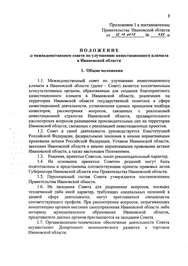 Постановление Правительства Ивановской области от 15.10.2015 N 485-п "О создании межведомственного совета по улучшению инвестиционного климата в Ивановской области" (вместе с "Положением о межведомственном совете по улучшению инвестиционного климата в Ивановской области")