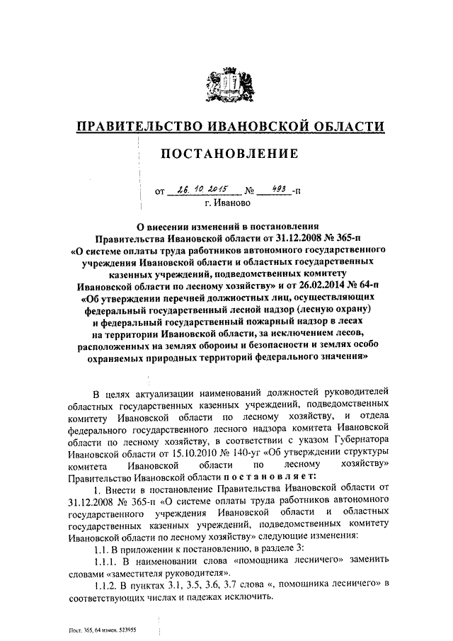 Постановление Правительства Ивановской области от 26.10.2015 N 493-п "О внесении изменений в постановления Правительства Ивановской области от 31.12.2008 N 365-п "О системе оплаты труда работников автономного государственного учреждения Ивановской области и областных государственных казенных учреждений, подведомственных комитету Ивановской области по лесному хозяйству" и от 26.02.2014 N 64-п "Об утверждении перечней должностных лиц, осуществляющих федеральный государственный лесной надзор (лесную охрану) и федеральный государственный пожарный надзор в лесах на территории Ивановской области, за исключением лесов, расположенных на землях обороны и безопасности и землях особо охраняемых природных территорий федерального значения"