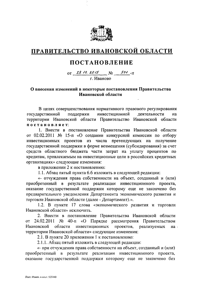 Постановление Правительства Ивановской области от 29.10.2015 N 501-п "О внесении изменений в некоторые постановления Правительства Ивановской области"