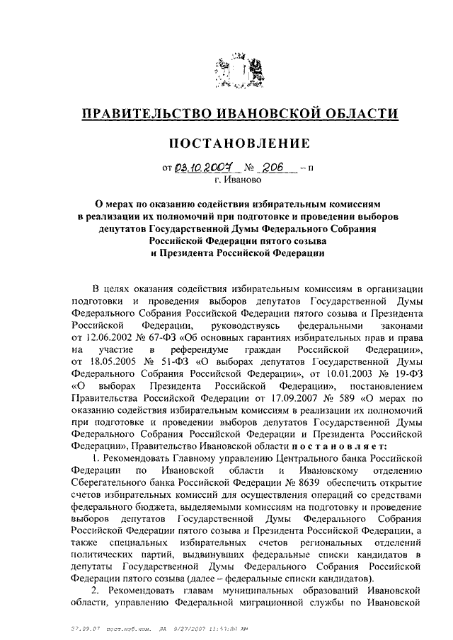 Постановление Правительства Ивановской области от 03.10.2007 N 206-п "О мерах по оказанию содействия избирательным комиссиям в реализации их полномочий при подготовке и проведении выборов депутатов Государственной Думы Федерального Собрания Российской Федерации пятого созыва и Президента Российской Федерации"