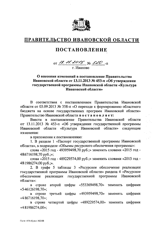 Постановление Правительства Ивановской области от 18.11.2015 N 520-п "О внесении изменений в постановление Правительства Ивановской области от 13.11.2013 N 453-п "Об утверждении государственной программы Ивановской области "Культура Ивановской области"