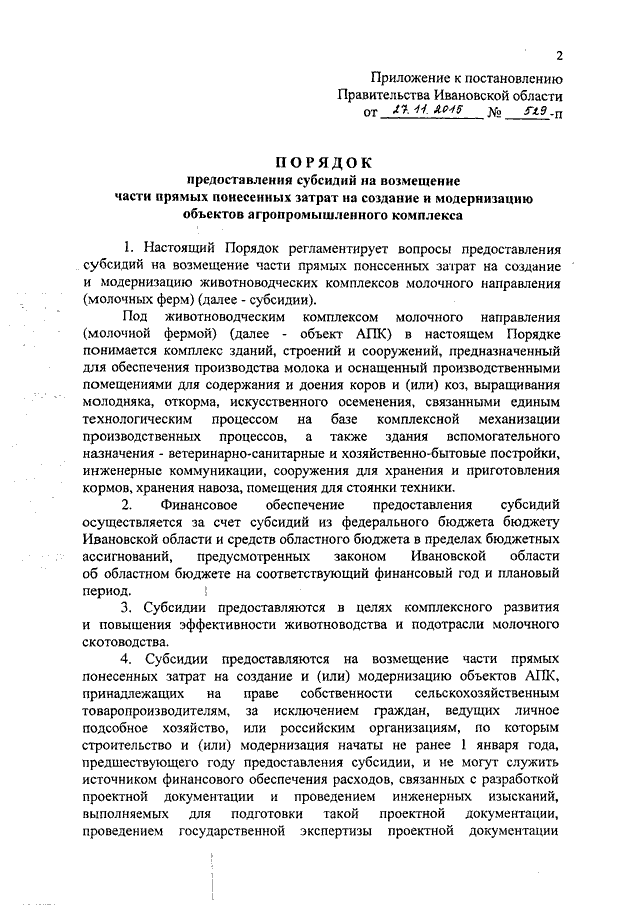 Постановление Правительства Ивановской области от 27.11.2015 N 529-п "Об утверждении Порядка предоставления субсидий на возмещение части прямых понесенных затрат на создание и модернизацию объектов агропромышленного комплекса"