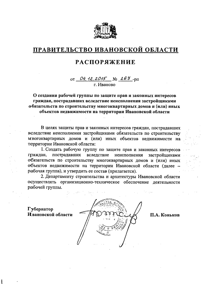 Распоряжение Правительства Ивановской области от 04.12.2015 N 267-рп "О создании рабочей группы по защите прав и законных интересов граждан, пострадавших вследствие неисполнения застройщиками обязательств по строительству многоквартирных домов и (или) иных объектов недвижимости на территории Ивановской области"