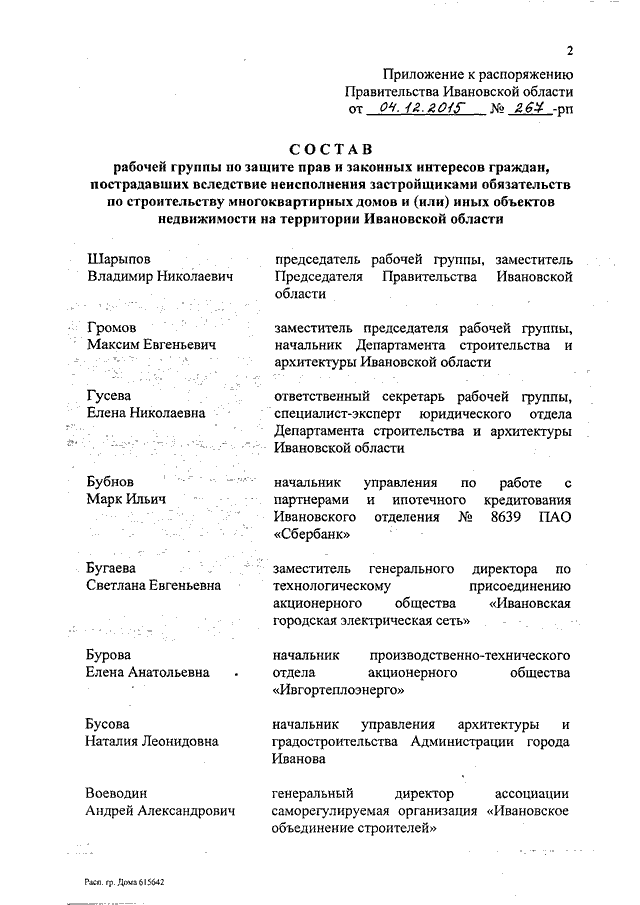 Распоряжение Правительства Ивановской области от 04.12.2015 N 267-рп "О создании рабочей группы по защите прав и законных интересов граждан, пострадавших вследствие неисполнения застройщиками обязательств по строительству многоквартирных домов и (или) иных объектов недвижимости на территории Ивановской области"