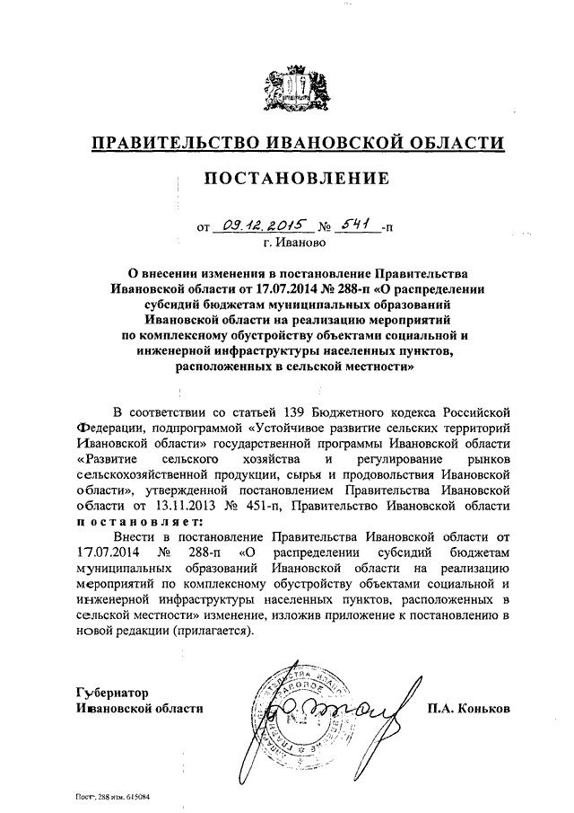 Постановление Правительства Ивановской области от 09.12.2015 N 541-п "О внесении изменения в постановление Правительства Ивановской области от 17.07.2014 N 288-п "О распределении субсидий бюджетам муниципальных образований Ивановской области на реализацию мероприятий по комплексному обустройству объектами социальной и инженерной инфраструктуры населенных пунктов, расположенных в сельской местности"