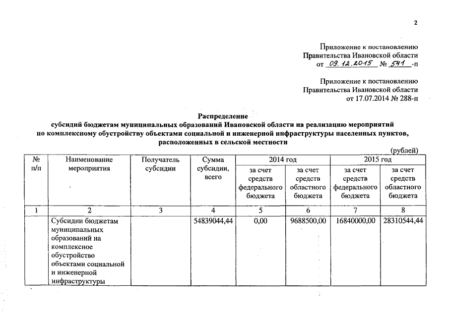 Постановление Правительства Ивановской области от 09.12.2015 N 541-п "О внесении изменения в постановление Правительства Ивановской области от 17.07.2014 N 288-п "О распределении субсидий бюджетам муниципальных образований Ивановской области на реализацию мероприятий по комплексному обустройству объектами социальной и инженерной инфраструктуры населенных пунктов, расположенных в сельской местности"
