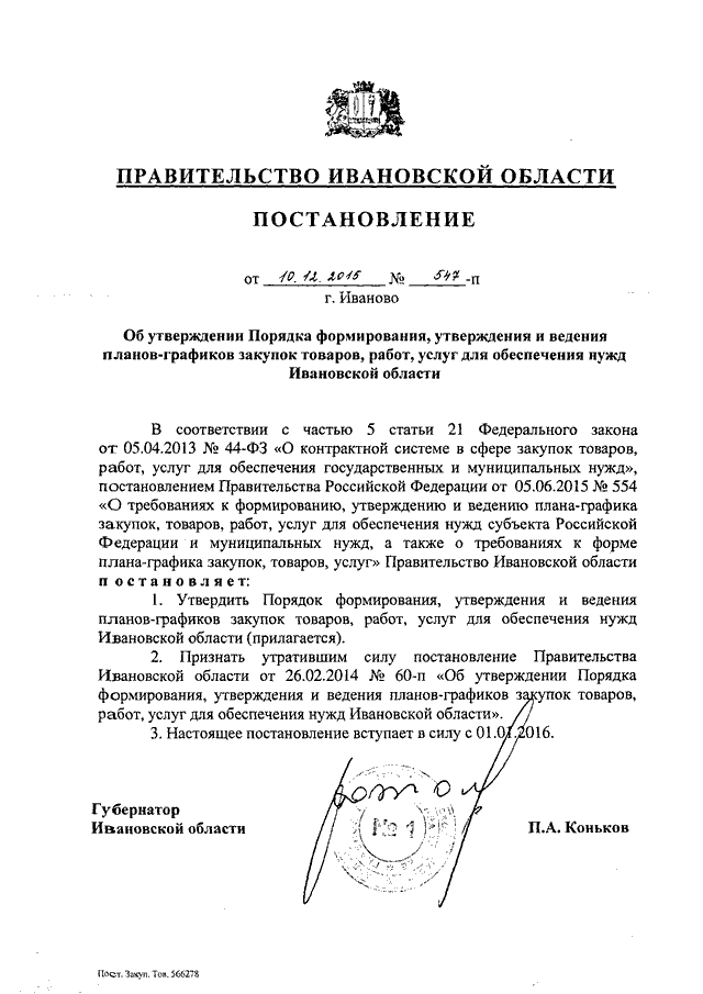 Постановление Правительства Ивановской области от 10.12.2015 N 547-п "Об утверждении Порядка формирования, утверждения и ведения планов-графиков закупок товаров, работ, услуг для обеспечения нужд Ивановской области"