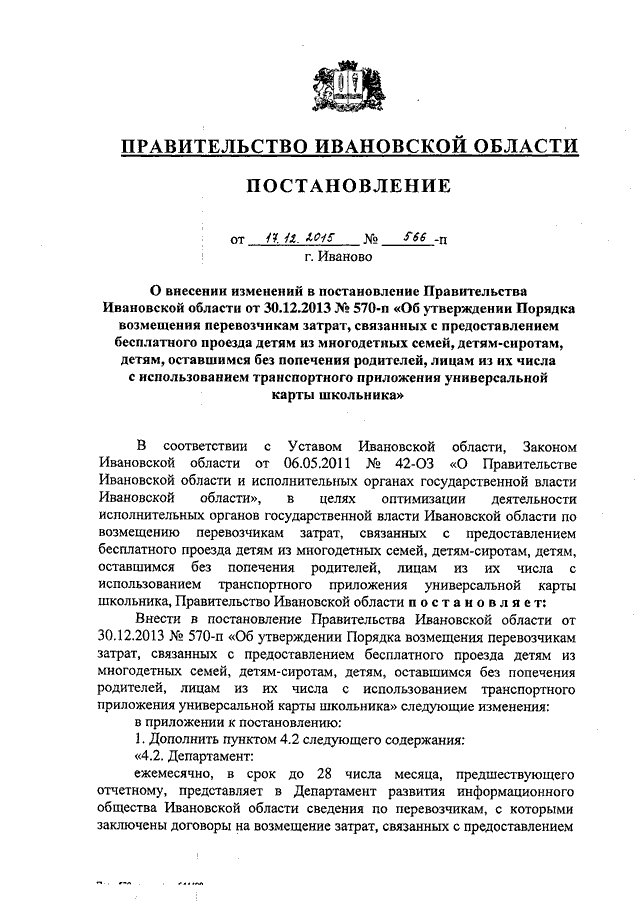 Постановление Правительства Ивановской области от 17.12.2015 N 566-п "О внесении изменений в постановление Правительства Ивановской области от 30.12.2013 N 570-п "Об утверждении Порядка возмещения перевозчикам затрат, связанных с предоставлением бесплатного проезда детям из многодетных семей, детям-сиротам, детям, оставшимся без попечения родителей, лицам из их числа с использованием транспортного приложения универсальной карты школьника"