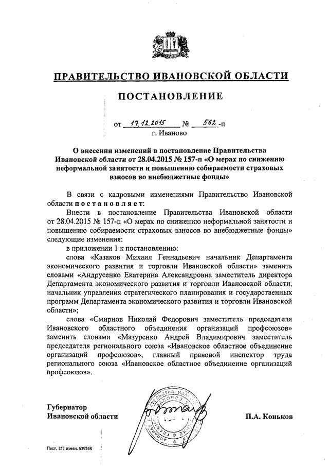 Постановление Правительства Ивановской области от 17.12.2015 N 562-п "О внесении изменений в постановление Правительства Ивановской области от 28.04.2015 N 157-п "О мерах по снижению неформальной занятости и повышению собираемости страховых взносов во внебюджетные фонды"