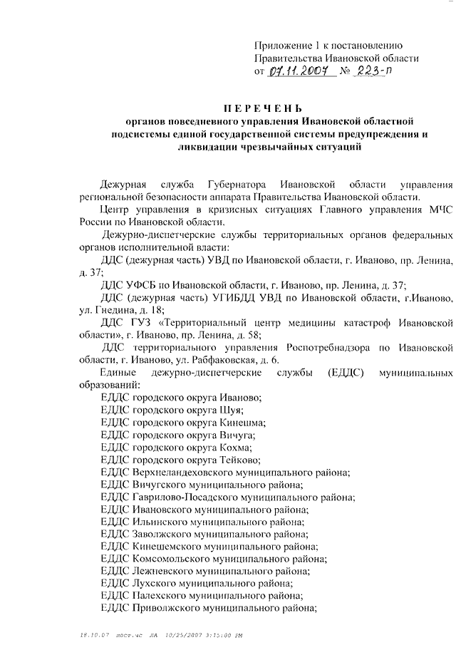 Постановление Правительства Ивановской области от 07.11.2007 N 223-п "Об организации функционирования органов повседневного управления Ивановской областной подсистемы единой государственной системы предупреждения и ликвидации чрезвычайных ситуаций" (вместе с "Порядком функционирования органов повседневного управления Ивановской областной подсистемы единой государственной системы предупреждения и ликвидации чрезвычайных ситуаций")
