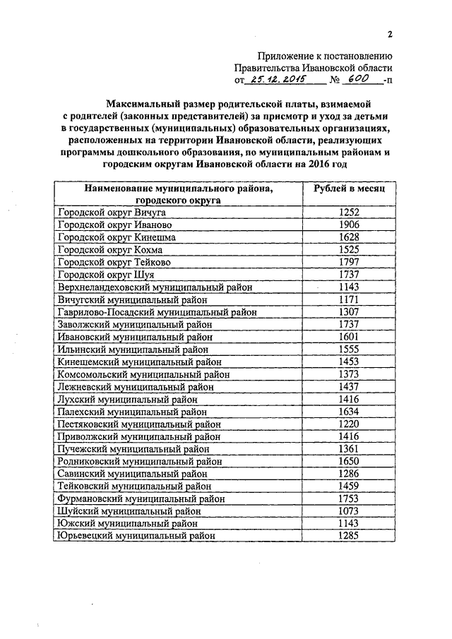 Постановление Правительства Ивановской области от 25.12.2015 N 600-п "О максимальном размере родительской платы, взимаемой с родителей (законных представителей) за присмотр и уход за детьми в государственных (муниципальных) образовательных организациях, расположенных на территории Ивановской области, реализующих программы дошкольного образования, по муниципальным районам и городским округам Ивановской области"