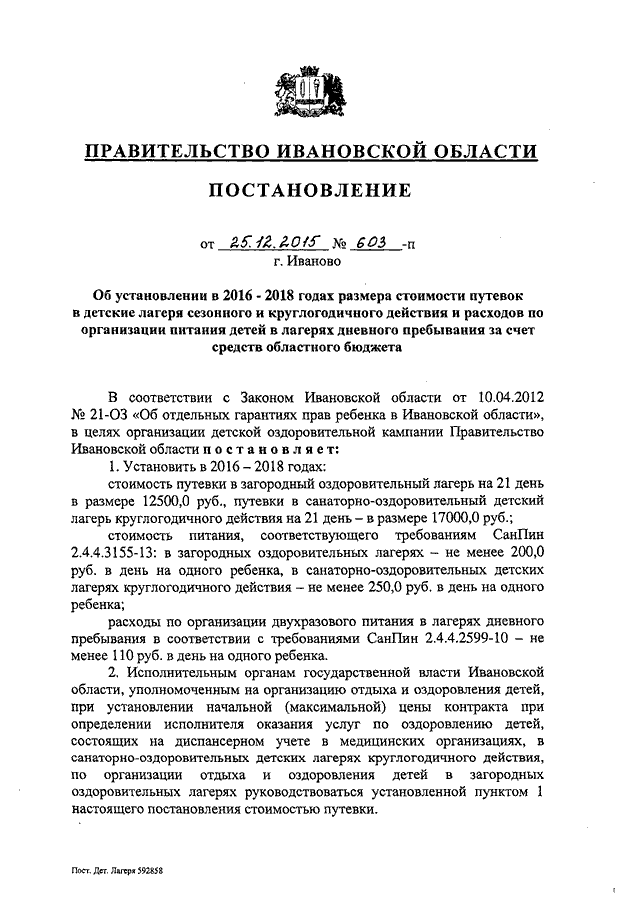 Постановление Правительства Ивановской области от 25.12.2015 N 603-п "Об установлении в 2016 - 2018 годах размера стоимости путевок в детские лагеря сезонного и круглогодичного действия и расходов по организации питания детей в лагерях дневного пребывания за счет средств областного бюджета"
