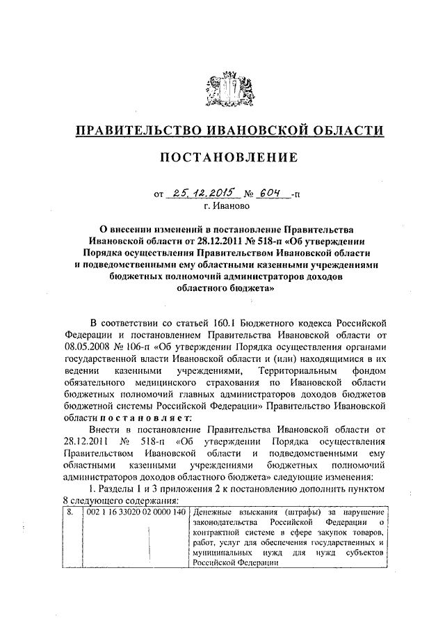 Постановление Правительства Ивановской области от 25.12.2015 N 604-п "О внесении изменений в постановление Правительства Ивановской области от 28.12.2011 N 518-п "Об утверждении Порядка осуществления Правительством Ивановской области и подведомственными ему областными казенными учреждениями бюджетных полномочий администраторов доходов областного бюджета" (вместе с "Перечнем администраторов доходов областного бюджета и закрепленных за ними источников доходов областного бюджета")